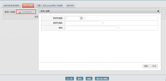 点击页面上方的【投资人信息】标签页,进入投资人信息录入页面,点击投资人信息右侧的图标按钮进入投资人信息页面进行录入,录入完成后点击【确定】,可继续点击图标按钮登记多个投资人信息。