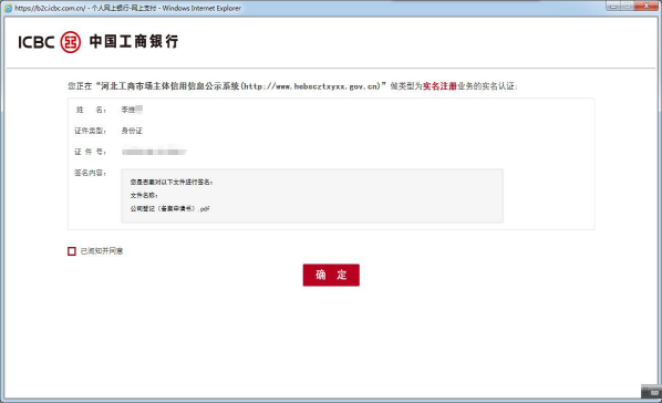 继续操作之后,出现如下界面,核对信息无误后,勾选已阅之并同意,并点击确定按钮,如下图: