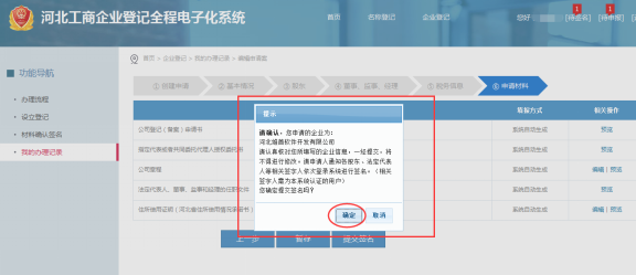 预览完所有的申请材料,对公司章程和住所使用证明进行编辑、填写完毕后,点击【提交签名】按钮将设立登记申请信息提交,并可进行全体股东、法定代表人签名确认(如果设立董事会、监事会的,那么董事和监事也需要签名),如下图: