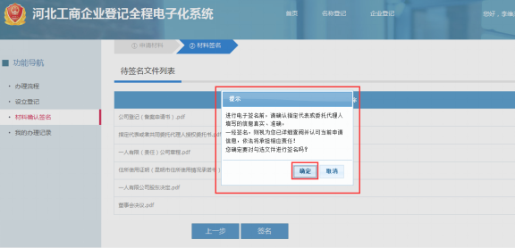 点击下一步按钮,进入材料签名页面,点击签名按钮,弹出对话框,点击确定按钮,如下图: