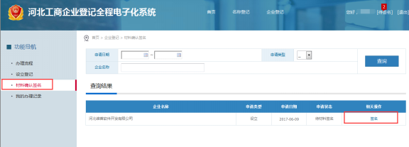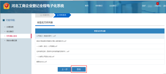 用户点击左侧的材料确认签名按钮,进行材料签名操作。页面上默认显示所有待确认签名的企业信息,也可以输入查询条件,比如申请日期、申请类型、企业名称等多种条件,点击【查询】按钮,可查询出满足查询条件的企业申请信息。然后在“查询结果”列表下点击【签名】按钮进行全体股东签名确认。在申请材料一栏,预览所有的申请材料,如下图。