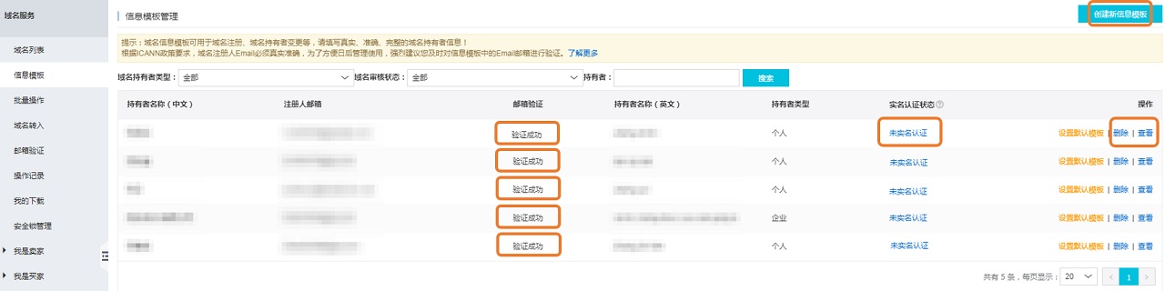 登录?域名控制台,单击页面左侧导航栏中的信息模板,在信息模板页面进行模板管理,如新建、删除、查看模板信息,提交实名认证等。