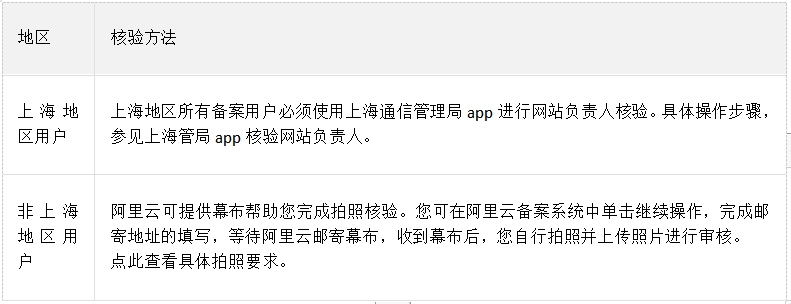 初审通过后,登录阿里云备案系统,办理网站负责人拍照核验。不同地区拍照核验方法不同,具体如下: