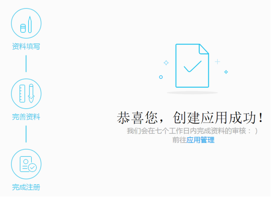 网站信息填写完成,点击“创建应用”后,网站应用创建完成,点击“应用管理”,进入管理中心,在管理中心可以查看到网站获取的appid和appkey,如下图所示: