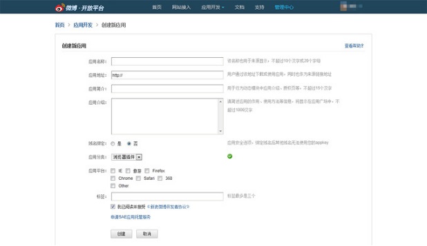 在开发者页面点击“登录”或者“创建应用”,通过帐号登录成为一名开发者。一个微博帐号可以管理10个不同的应用,建议开发人员使用官方微博的帐号,以便统一管理。