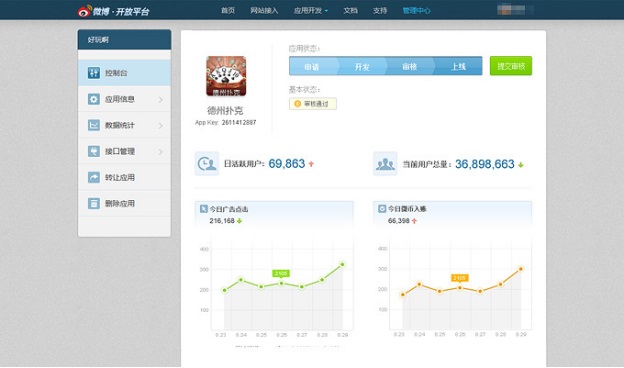 在“管理中心”可查看应用信息。App Key是应用唯一的识别标志,微博开放平台通过App Key鉴别应用的身份。App Secret是给应用分配的密钥,你需要妥善保存这个密钥,从而保证应用来源的的可靠性,防止被伪造。你可通过这两个数据进行相关的技术开发工作。