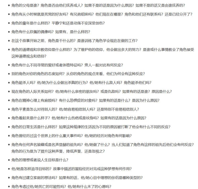 不久前,来自腾讯天美工作室的游戏策划,古典文献学硕士就曾讨论过如何设计有吸引力的游戏人生。并在文中分享了一个网文编辑,用于训练作者如何做好一个网文人设的工具,《建立角色的20个问题》。