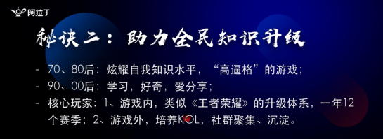 其实整个游戏当时能够形成比较强的社交传播也是基于答题内容或者是答题题目的优化,在整个微信人群中人群的年龄层次比较大,对于整个游戏题目的内容难度分配和运营能力要求比较高,举个例子,我们的歌曲题目很多的老歌年轻人没听过,新歌老人没听过,在题目运营和出题逻辑我们还做了很多的优化。