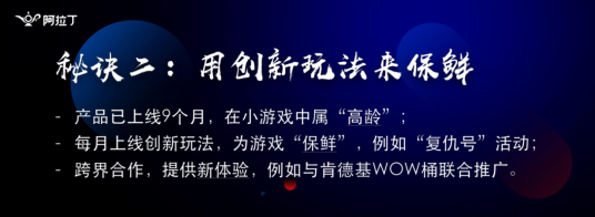 在我们的游戏设计中每一个月我们就要研发一款新的能够跟主线相关的小型的游戏玩法,大家可以想象每一个月我们的产品运营团队都要创立一款新的小游戏,而且这款小游戏能够有效的跟我们的主线进行结合,这也是对于整个游戏的运营后期比较重要的要求。