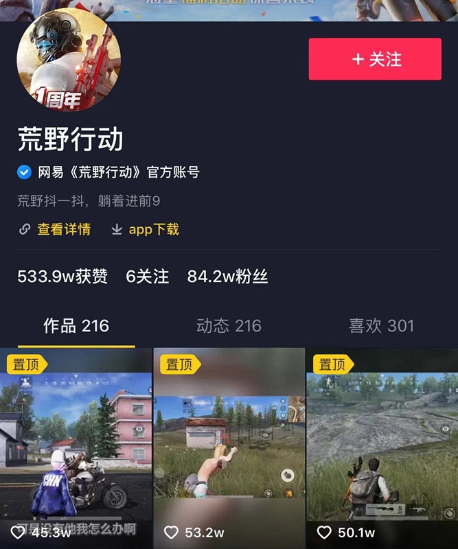 以及在年轻人关注度较高的短视频内容领域(如抖音),网易也于早期运营了“荒野行动”官方账号,发布游戏趣味视频、攻略、企业文化等内容。相比其它产品,《荒野行动》站在了起跑线靠前的位置,这种先发优势使得游戏初期获得了不错的流量,截止发稿前,该账号有着84.2万粉丝和533.9万点赞。