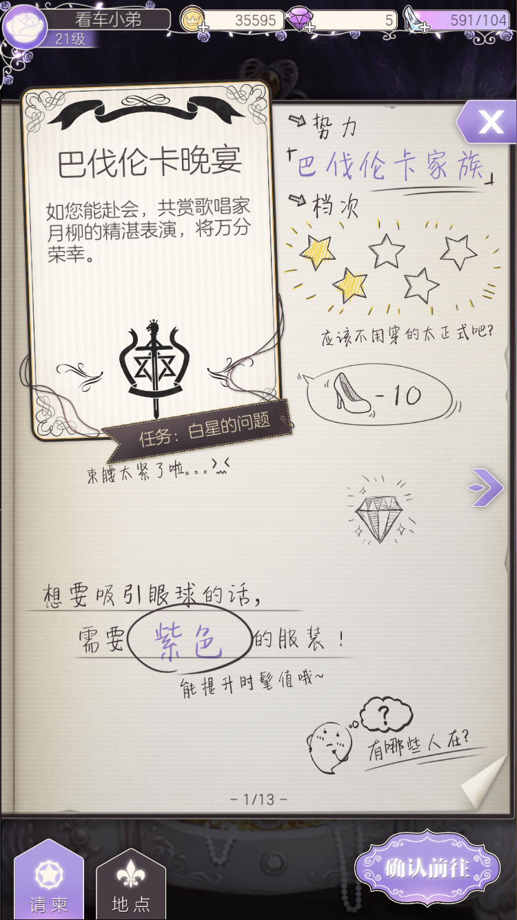 游戏基本的玩法就是收到邀请函参加舞会,部分舞会将推动主线剧情,其他的则是任务性质可以重复刷的舞会,此外还有酒馆、女仆集会所、螺旋尖顶和贫民窟四处副本地点。当然,前往每一处舞会和地点的前提就是按照要求打扮自己。