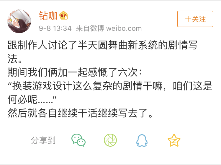 钻石咖啡鸦本人在游戏开发的过程中也多次在微博上表达了这次文本工作的难度,不仅仅是在文字量上,更多的是对细节的设计与把控。她还微博上自嘲,不明白为什么要把一个换装游戏的剧情写得如此复杂。但就成果和实际体验来说,葡萄君对钻咖老师和制作团队深表敬佩。