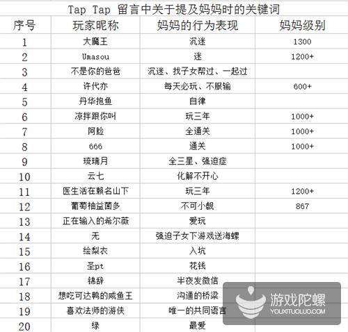 同样,在TapTap中玩家对《开心消消乐》的评价中,除了玩家自己,妈妈的提及率是最高的,几乎每一个评论页面都会提及到自己的妈妈。笔者把玩家提及到的妈妈玩这款游戏的情况作了总结: