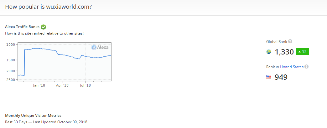 此外,根据 Alexa 的数据统计,Wuxiaworld 网站在全球网站排名中为 1330 名,日均 IP 访问量约为 14 万,日均 PV 访问量约为 160 万。