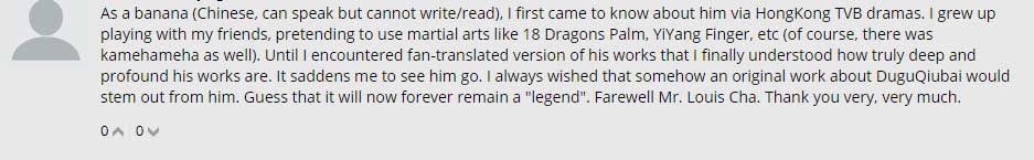 作为一个只会说,不会写也不会阅读中文的华人,我第一次知道金庸是因为香港 TVB 的港剧。小时候我和我的小伙伴一起玩耍的时候会用降龙十八掌、阴阳指等等招式。但直到后来我接触到了翻译后的金庸先生的作品时,我才意识到他作品的影响有多深远。他的离世让我很难过,我总是期待或许以后还会有一个以独孤求败为原型的作品能由他亲自操刀,但看来这将永远成为一个传说了。再见,金庸先生,非常非常感谢你。