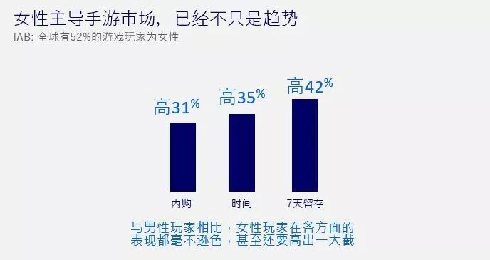 在游戏行业,女性玩家的占比也已经达到了52%,和男性玩家平分秋色,名副其实“顶起半边天”。事实上,早在2014年一项全球研究就表明,与男性玩家相比,女性玩家不管是在内购、游戏时间还是7天留存率方面,表现都更为出色。