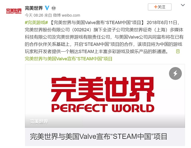 今年6月份,完美世界公布,旗下子公司完美世界征奇及完美世界游戏,与Steam运营方美国Valve公司宣布,双方将在已有的合作伙伴基础之上,开启“STEAM中国”项目的合作。