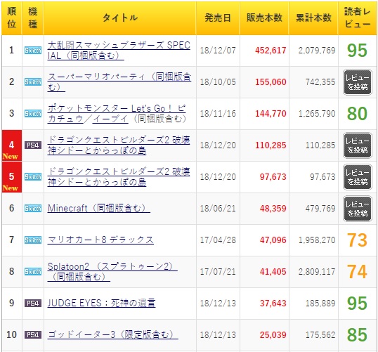 回到《任天堂明星大乱斗》帮任天堂蝉联十年日本地区主机游戏的销量冠军宝座这件事上看,十年来,夺冠的任天堂平台游戏销量总体趋势呈下滑状态。如十年前是NDS上的《勇者斗恶龙9》夺冠,销量为410万;十年后的今天《任天堂明星大乱斗》夺冠,日本当地销量却只有200万出头。即便2018年最后一周《任天堂明星大乱斗》再度爆发,总销量也不过250万。