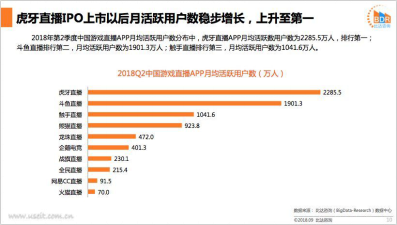 据BigData-Research发布的《2018年第二季度中国游戏直播市场研究报告》显示,在2018年第2季度主要游戏直播APP月均活跃用户数排行中,虎牙直播月均活跃用户数为2285.5万人,排行第一;斗鱼直播月均活跃用户数为1901.3万人,排行第二;触手直播月均活跃用户数为1041.6万人,排行第三。