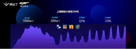 先看下我们在微信小游戏上的数据,我们在18年5月底上线了第一款小游戏《钢琴块2》,接着上线了其他3款游戏,这4款游戏累计的用户大概7000多万,日活跃用户突破300万,7日留存13%以上,次日留存32%,这个数据是比较超出我们的预期的,这也说明了小游戏非常大的潜力。