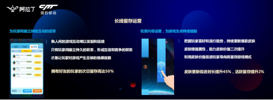 首先是在长线留存这块,这里说两点,我们会在游戏内会创造各种各样的条件去让用户交流起来,比如我们会去运营一些玩家的交流群,然后在游戏内会开发这种世界聊天频道和好友系统,通过游戏内、游戏外的方式会把玩家的社交关系建立起来,通过这种方式会比较好的提高玩家间的关联度和粘性,整体上会带来游戏整体上长线留存的提升。比如说在游戏内如果添加了好友,那么次日留存就会提高50%。
