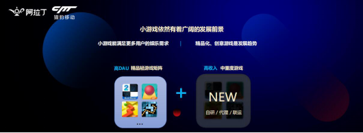 最后我们再讲下小游戏未来的思考,我们认为小游戏还有非常大的发展前景,因为它把玩家的进入门槛大大的降低,导入了很多非游戏玩家,我觉得这是非常好的方式。另外随着这种方式对导入用户的培养,随着他们游戏品味的提升,后面的小游戏一定是向精品化、独特性方向去发展,所以后续我们也会做精品化的路线,主要包括两块,一个是高DAU型轻度游戏,也会尝试中重度的内购游戏。