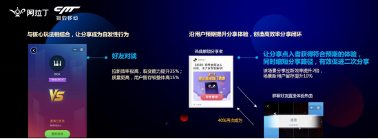 第一个是好的社交裂变是基于玩法本身的,分享是自发性的,这样带来的效果是非常好的,比如我们上线了一个好友对战的玩法,这个功能上线后整体裂变有了35%的提升,裂变成功率是非常高的,带来的用户质量也非常高、用户留存较整体高15%,会比其他场景带来的用户质量高很多。