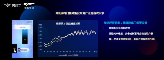 另外在游戏的定位上,其实我们会更多的去考虑微信上哪些轻度的游戏玩家,在新手引导的时候会做的更加傻瓜式的,让哪些没有玩过游戏的人也可以很快上手,另外游戏难度上,可以看这个图,这是我们APP游戏和小游戏版本的难度对比,可以看到在游戏的前期我们会把整个游戏的难度大幅的下调,这样带来的结果是我们整体的玩家的第一关的通关率提升了1倍、新用户时长提升50%,有非常大的提升,很好的解决了轻度游戏玩家的体验。
