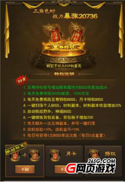 想在游戏里充值,什么最划算?当然是月卡和特权卡啦!堪称充值玩家的必备神器,现在游戏中有两种卡可以选择,一种是月卡,需要30RMB,一种是特权卡,需要78RMB,如果两种卡一起购买,只需要88元哦!非常划算,而且购买之后,你还将获得至尊特权称号,它可以让你增加稀有属性,对BOSS伤害加成5%,6得不行!