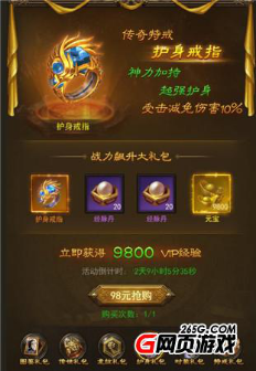 新服活动还有限时直购,有多种选择可全方位提升战力,只要充值98元,即可获得战力飙升大礼包,其中包括:护身戒指,20颗经脉丹*2,9800元宝,同时还能立即获得9800VIP经验,礼包中最值得一提的就是护身戒指了,作为传奇特戒,它具有神力加持,超强护身,受击减免伤害10%!