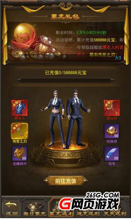 玩游戏是一个沉淀的过程,如果你玩《斩月屠龙》很久,并充了很多钱,游戏也不会亏待你,为了感谢玩家的支持,当你累计充值到588888个元宝的时候,可领取超酷炫黑衣人时装太壮,稀有传世之刃、龙魄碎片,盘古斧,50经脉丹,50羽毛,都是些罕见的材料哦!