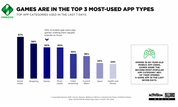 Newzoo发现,在过去七天内,有二分之一的手机应用用户打开了游戏应用,使得游戏成为仅次于社交媒体和购物的第三大热门应用。