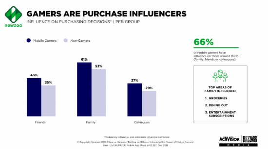 手机游戏玩家是一个非常有影响力的群体,三分之二的手机游戏玩家对他们的朋友,家人或同事的购买决定有影响力。在购买影响力上,手机游戏玩家比非游戏玩家高出23%。
