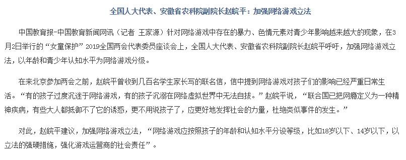 据中国教育新闻网报道,针对网络游戏中存在的暴力、色情元素对青少年影响越来越大的现象,全国人大代表、安徽省农科院副院长赵皖平在3月2日举行的“女童保护”2019全国两会代表委员座谈会上呼吁,加强网络游戏立法,以年龄和青少年认知水平为网络游戏分级。