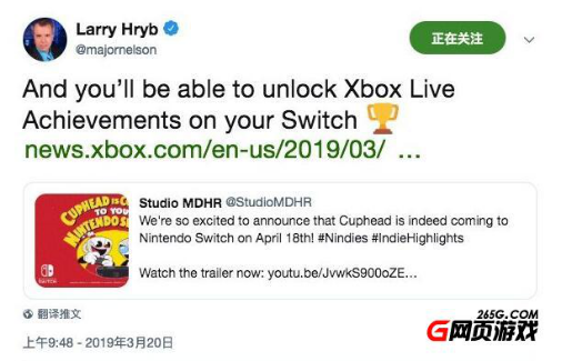 同时另一位Xbox负责人表示Switch版《茶杯头》支持Xbox Live成就系统。