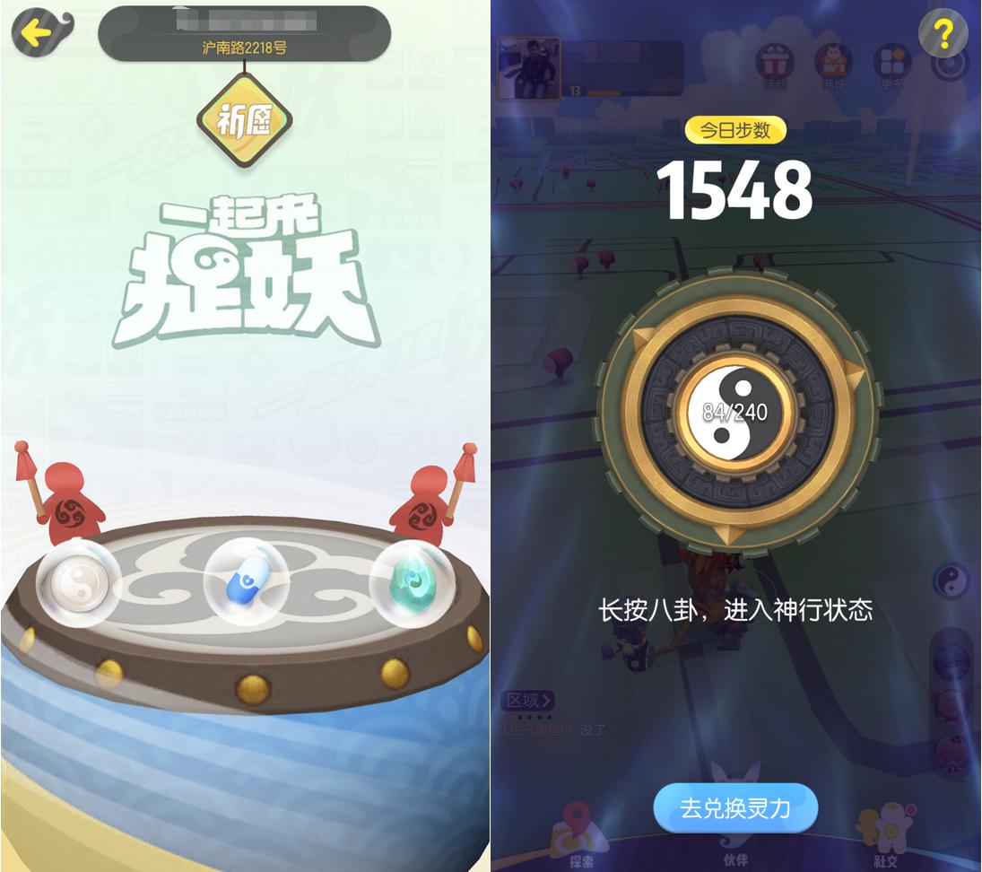 对于在特定时间段没有条件出行的玩家,地图中还会随机出现可以用来聚集妖灵的祈愿鼓,击鼓之后周围的妖灵刷新数量增多。同时,为了满足玩家捉妖需求,游戏里还加入了无视空间束缚的神行玩法,让玩家们可以在特定时间内无视地理限制地行走,但这种功能需要消耗灵力,而灵力同样需要玩家通过出行步数免费兑换——这又在无形中促使玩家在有条件的情况下尽可能走出家门累积步数,从而达成健康出行的目的。