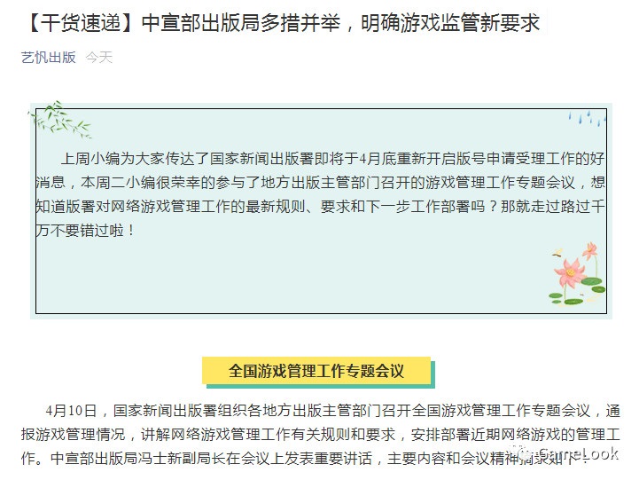 根据艺忛出版透露的信息,4月10日国家新闻出版署召开了全国游戏管理工作专题会议;4月12日下发消息游戏产品版号申请即将开闸;4月16日,地方出版主管部门则召开了游戏管理工作专题会议,环环相扣。