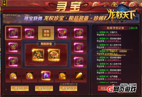 你是否厌倦了整日在游戏里打打杀杀,却又喜欢紧张刺激的游戏体验?37《龙权天下》的寻宝系统可让你不必参战也同样能体验到紧张感,参与寻宝将获得大量装备、材料,更有稀世珍宝等着你,如果一次性寻宝50次,还必定会获得稀有的龙权珍宝,想想都有点小激动,你还在等什么?趁着游戏公测,赶紧叫上小伙伴一同来玩游戏吧!说不定借着这一特别的日子,还有额外的奖励哦!