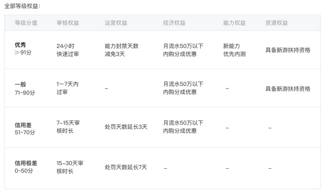 主体信用分旨在鼓励开发者注意每一个小游戏帐号的行为规范,长线布局,按照平台规则合规运营。对于高信用分的主体,平台愿意提供其更多的权益,而信用差时其主体权益也会受到影响。
