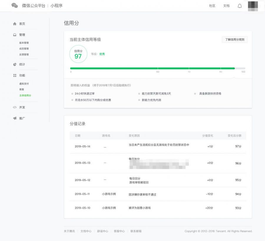 很多小游戏开发者应该已经发现,在小程序管理后台多了主体信用分功能。