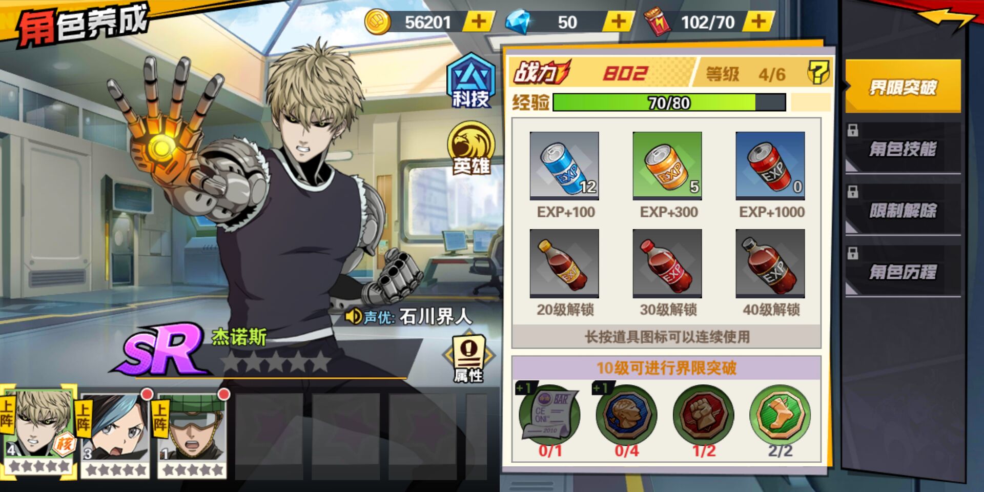在人物设定方面,也完整还原了原作中丰富的角色。除了常规的立绘、声优、动作技能,游戏还为所有角色加入了动态立绘特效,看起来也更加立体。只不过《一拳超人:最强之男》里并没有采用原作设定中的SABC等级划分制度。