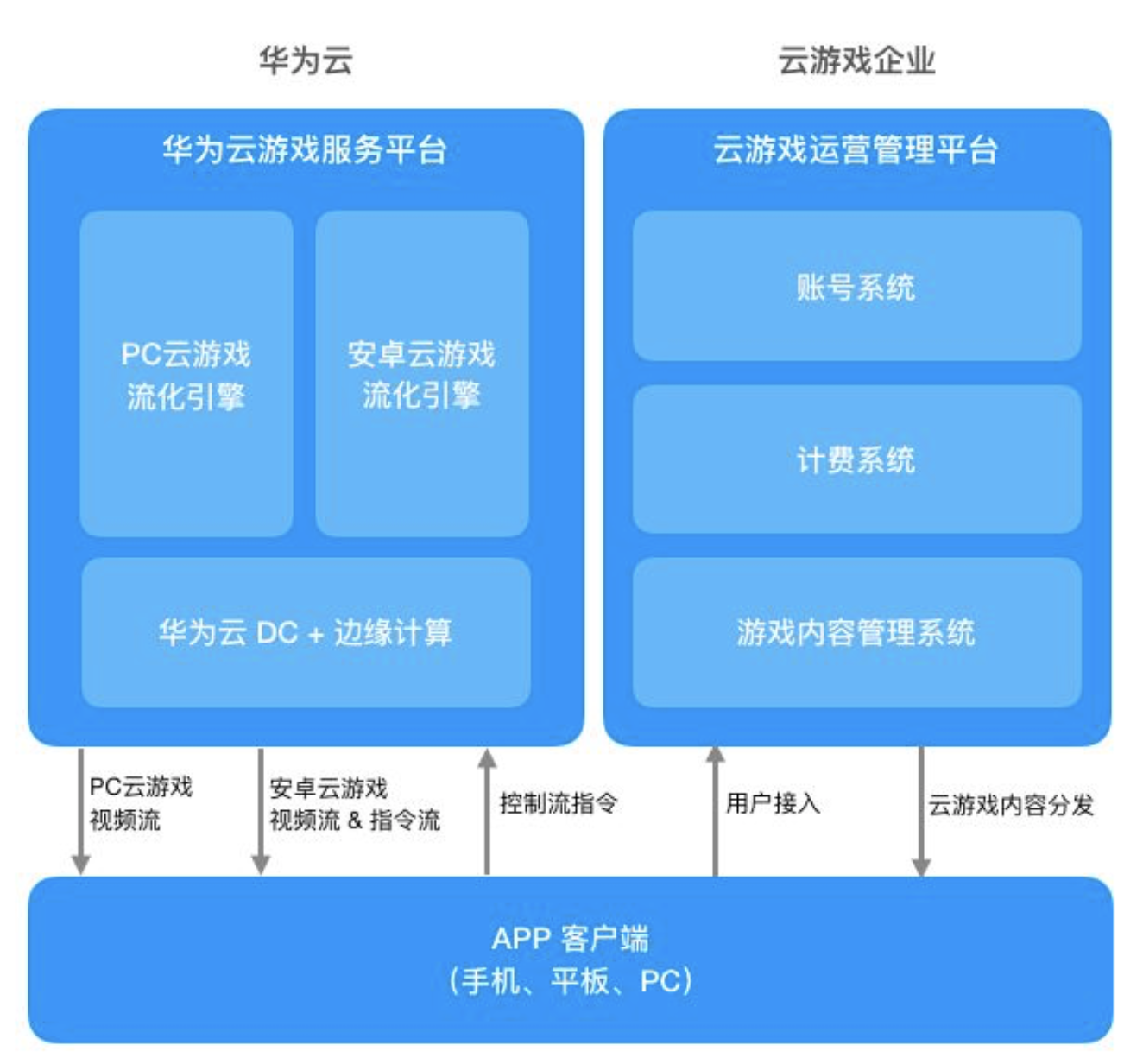 据文章内容,在PC云游戏方面华为已经与网易《逆水寒》合作,而在安卓云游戏方面,华为云则提供了指令流技术,即手机从云端获取游戏的 OpenGL ES 渲染指令,再用手机终端的 GPU 把这些指令渲染出来。这样以来手机可以承载一定的运算量,从而降低云端的压力和成本,也可以在已有的大量不带显卡的 ARM 服务器上直接运行。