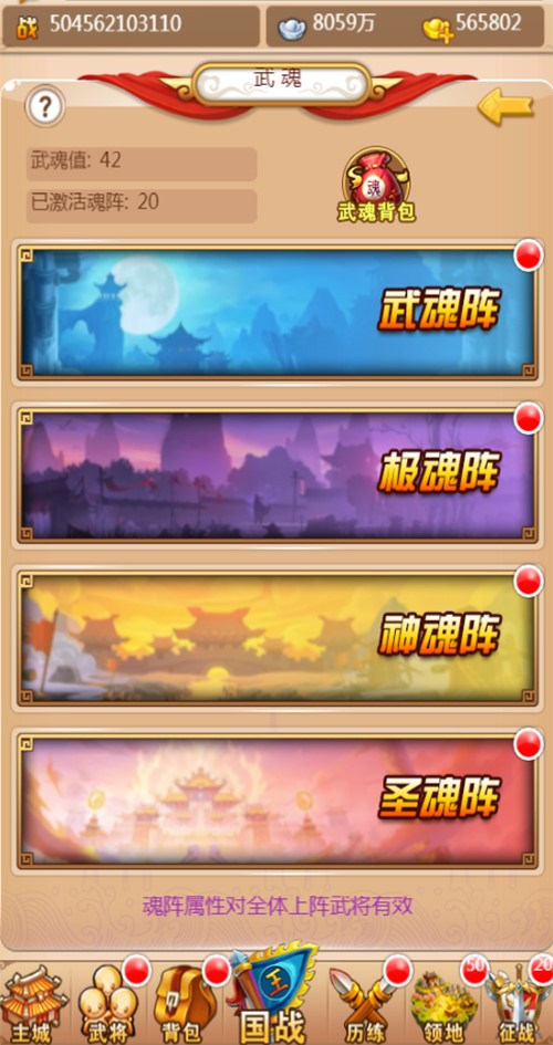 新版本中开启了武魂培养玩法,玩家可通过主公府进入武魂系统,整个养成系统包含武魂阵、极魂阵、神魂阵、圣魂阵。每个魂阵又包含5个章节收集,收集武魂并激活魂阵,战力飙升,推图PK更为轻松,武魂殿系统与点将更可获得海量武魂,助阵武魂收集。