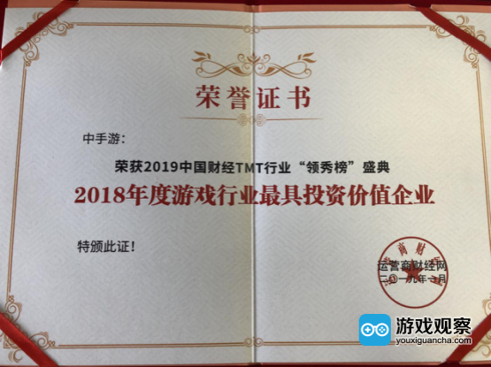 由运营商财经网发起的“2019中国财经TMT领秀榜盛典”在北京国际饭店隆重举行。在本次活动中,主办方揭晓了2019中国财经TMT领秀榜的最终评选结果。经过众多互联网、科技以及产经领域专业人士共同参与投票,主办方最终评出了运营商及通信设备类的25个奖项,以及产经领域非运营商类的38项大奖。其中,中手游凭借过去在IP游戏领域所作出的优异成绩,于本次评选中获得了“2018年度游戏行业最具投资价值企业”奖。