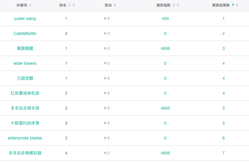 7月5日,游戏发布3.0版本,换了新的名字,一口气又连蹭了几款重磅产品。ASO关键词列表显示,它设置过的搜索关键词还包括万国觉醒、红警、多多自走棋等,并且这些关键词的搜索结果排名都很靠前。