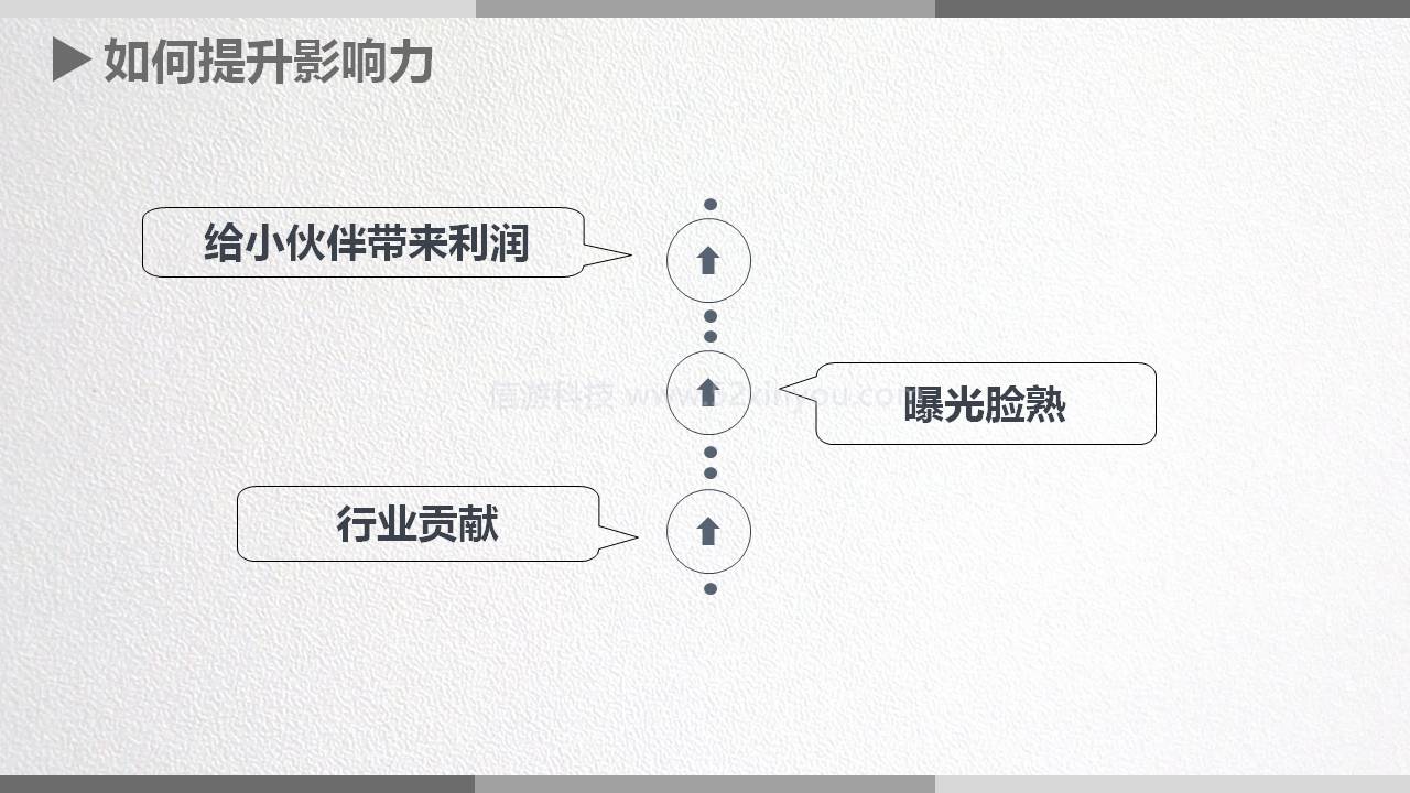 2. 曝光脸熟,可能很多团队不愿意参加业内组织的活动,觉着没必要,尤其是小团队会觉着可能没有面子不好意思,其实曝光脸熟很重要,可以去参加展会或者自己发新闻搞些专访,炒作自己炒作平台,多参加业内活动,多曝光混个脸熟,有什么事一说是某某平台某某公司,别人一听就知道你是谁,这就有用,当别人愿意跟你对话时,说明了您对他有影响力。