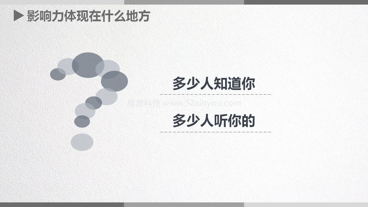 2.多少人听你的,指的是你的号召力,比如你组织一个活动,可以请来多少行业知名人物,又比如你做了一个不错的东西,想在行业内普及,有多人用你的,有多人会信你,又有多少人会听你的。