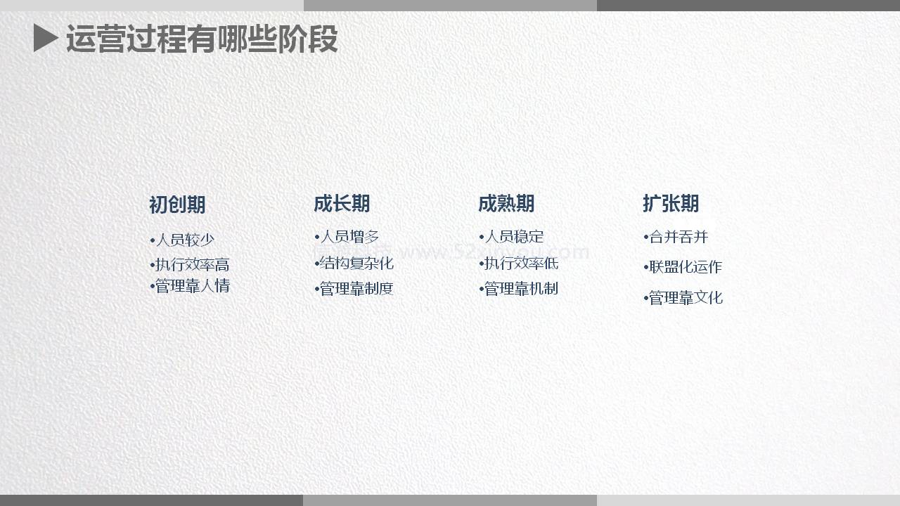 2.成长期:初创期经历一段时间赚到钱了就到成长期,成长期发展势必要招人,人员增多团队结构开始复杂化,之前的章节也介绍过运营团队都有哪些部门,各个部门都有了,这时单靠老板就无法管理了太累了,这个时候就需要完善的管理规章制度,绩效考核、 工资核算 、奖金发放、 休假制度等帮助约束管理团队。