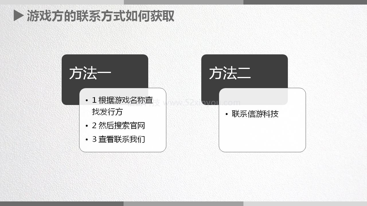 方法二:联系信游,直接联系我们,我们可以直接把相应的游戏厂商联系方式给你。