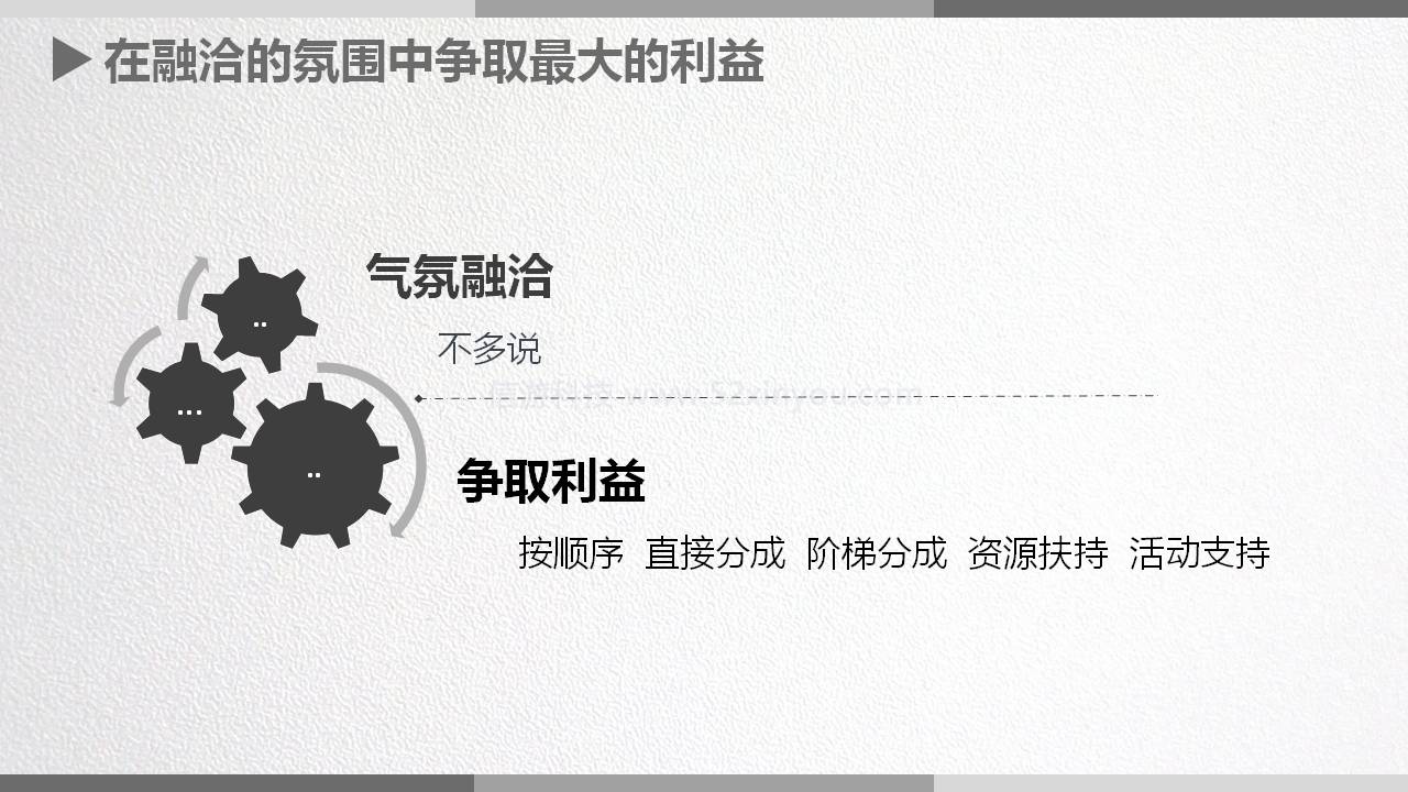 2.争取利益:谈合作时,争取利益是要按顺序来的,第一点直接分成,他说三七,咱们说二八行不行,谈好分成这就是第一点。第二点阶梯分成,如果我们这个月充值突破500万,你再让我5个点行不行,再争取点阶梯分成。第三点资源扶持,我这么努力的推广,这么多的流水,是不是要好好支持支持我,给我点内部号啊发发奖励弄点装备什么的。第四点活动支持,平台要给这个游戏搞活动给点资源支持支持呗。这些都是可以谈的不要认为谈个分成就没了,主要就是谈这些给自己争取最大利益,至于其他的审核合同,这个点怎么样啊,双方的权益啊责任啊义务啊这些没啥意义, 差不多都这样的制式合同没什么可谈的,主要是争取咱们以上说的这些利益最大化。